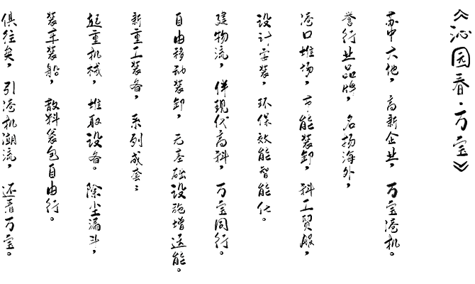 量身定制,港口、堆場(chǎng),散體和粉體物料,裝船、堆高、輸送設(shè)備,工藝設(shè)計(jì)、設(shè)備制造 和安裝調(diào)試。提供整體解決方案和技術(shù)支持。提供全新的港口裝卸理念,輕松擴(kuò)大港口經(jīng)營(yíng)范圍。